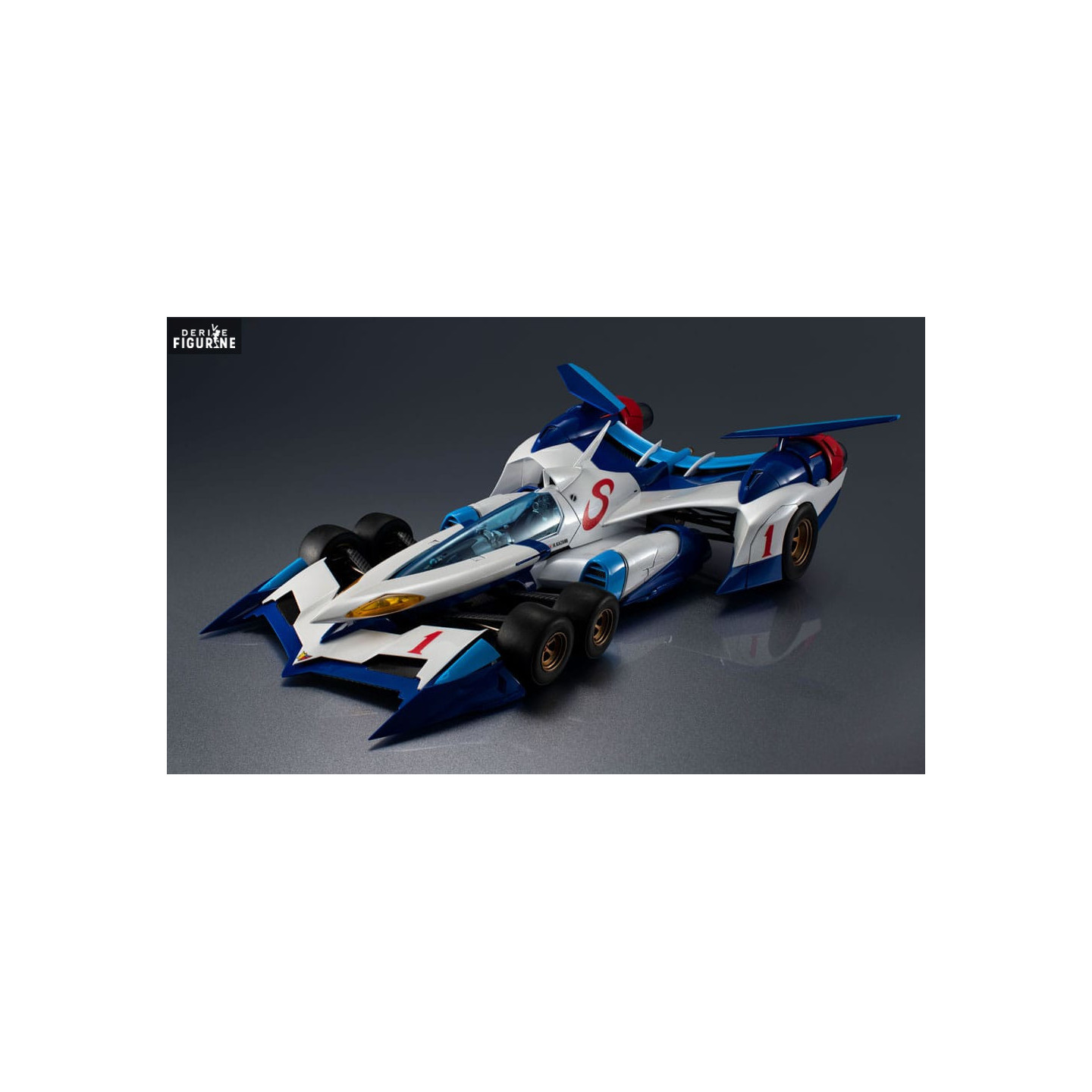 Le SIN V Asurada AKF-0/G est un bolide futuriste piloté par Hayato Kazami dans l'univers de Cyber Formula, une compétition de course automobile où la technologie et la vitesse se rencontrent dans des courses intenses. Ce modèle est conçu pour capturer chaque détail du véhicule tel qu'il apparaît dans l'anime, avec des lignes aérodynamiques, un cockpit détaillé, et un schéma de couleurs fidèle, combinant le blanc, le bleu et le rouge pour un rendu saisissant.