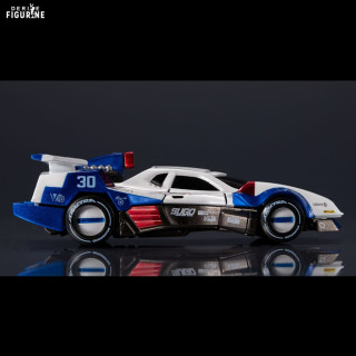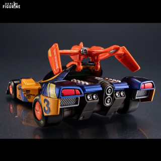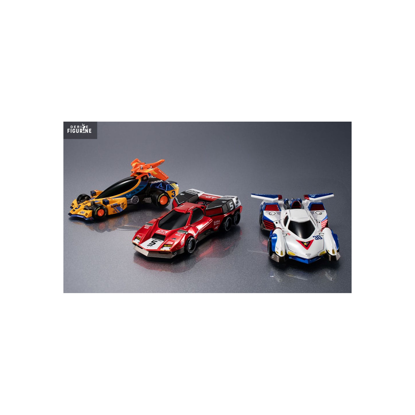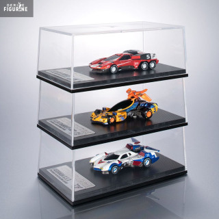 Le design reprend fidèlement les lignes et les couleurs originales : l’Asurada G.S.X avec son châssis blanc et bleu aux accents rouges, l’Albatrander 602 en rouge vif rehaussé de noir et d’argent, et l’Aoi Superion GT mêlant jaune et noir avec un imposant aileron arrière. Chaque voiture est finement détaillée pour refléter l’esprit et la puissance qu’elles dégagent dans la série.