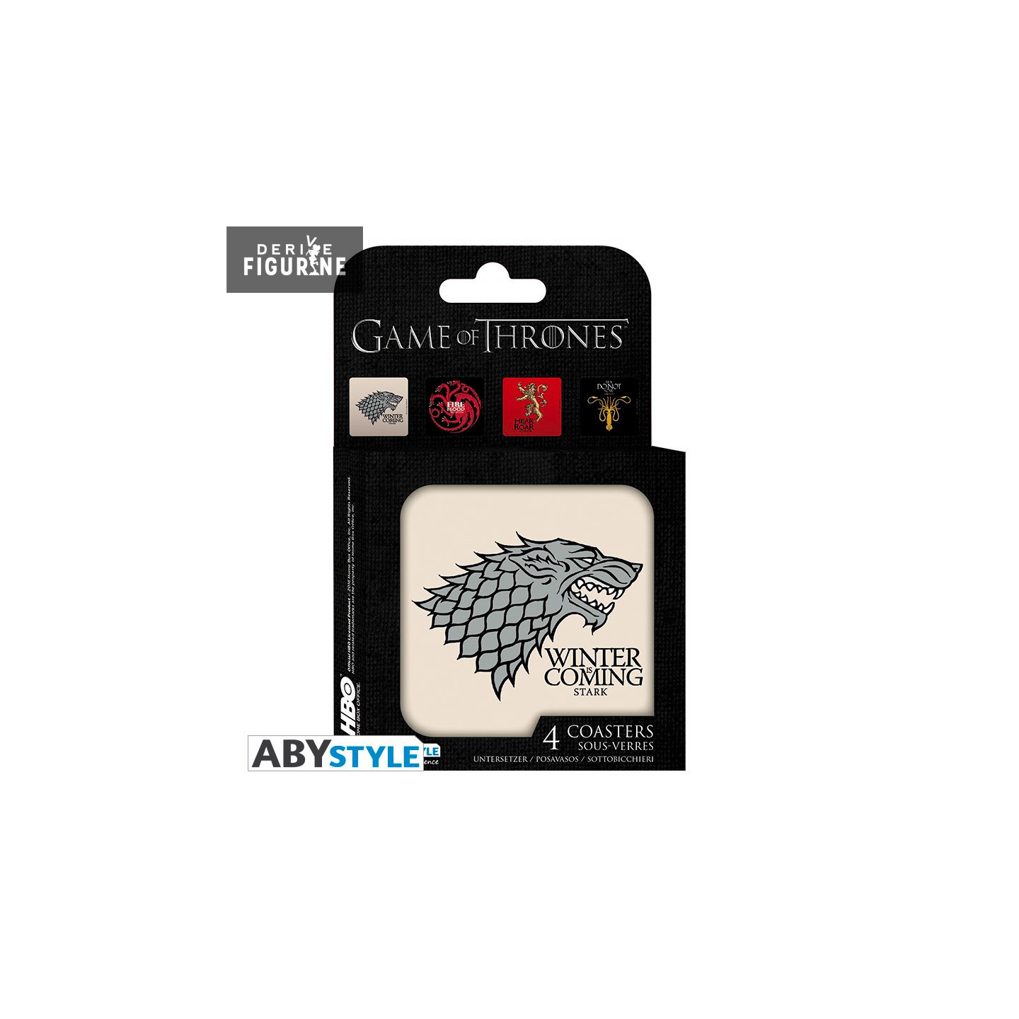 Set dessous de verre Game of Thrones représentant les emblèmes de quatre maisons qui mesurent environ 9,5 centimètres de haut. Le dessous est en liège. Le fabricant est ABYstyle.