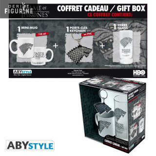 Vous voulez offrir un cadeau Game of Thrones à un ami mais vous ne savez pas quoi lui prendre ? Voici un coffret cadeau idéal pour l'occasion. Il contient un mini-mug de 11 cl, un porte-clés en PVC et enfin un verre de 29 cl. Le tout, à l'effigie de la maison Stark.