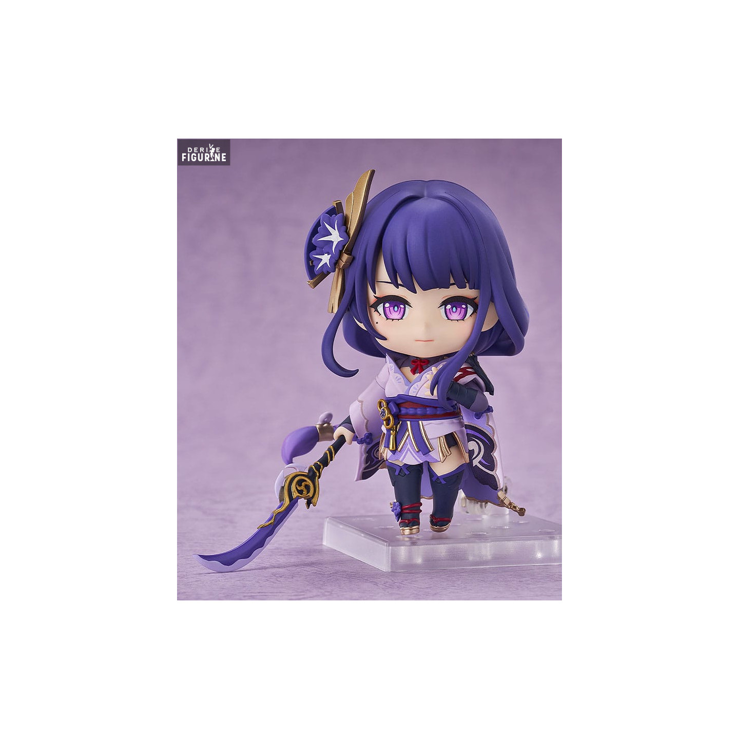 La figurine comporte plusieurs accessoires distinctifs, notamment son arme légendaire, qui renforce l'aspect martial de Raiden Shogun, et différents visages pour représenter ses diverses expressions, de la sérénité à la concentration en passant par la détermination froide. Son kimono, aux nuances de violet et de doré, est soigneusement reproduit, reflétant la majesté de son statut d'Archon.