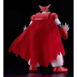 Le design reprend le code couleurs classique : rouge vif sur les membres et les épaulières, blanc sur les jambes et les avant-bras, et un gros bloc abdominal jaune entouré d’une ceinture sombre. Le torse est détaillé avec des plaques vertes, tandis que la tête arbore un visage stylisé, des cornes pointues et un orbe vert au centre. Getter 1 porte une grande cape rouge qui tombe dans son dos et s’ouvre sur les côtés, ce qui renforce sa silhouette héroïque. Dans sa main droite, il brandit une énorme hache à lame texturée, avec une masse cloutée sur l’autre côté du manche. Les proportions épaisses et les pieds larges assurent une bonne stabilité une fois le kit monté et posé sur une étagère.