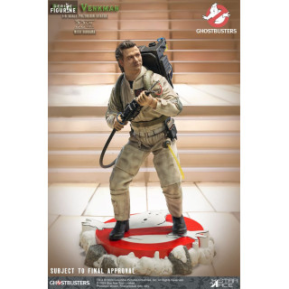 La figurine repose sur une base diorama représentant le logo emblématique des Ghostbusters, avec un fantôme barré d'un cercle rouge. La base est conçue pour ressembler à un morceau de rue de New York, avec des détails de gravats et de pierres, ajoutant une dimension réaliste et immersive à la présentation de la figurine.