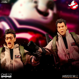Pack de figurines officielles SOS Fantômes (Ghostbusters) mesurant environ 17 centimètres de haut, à l'échelle 1/12. Le fabricant est Mezco Toys.