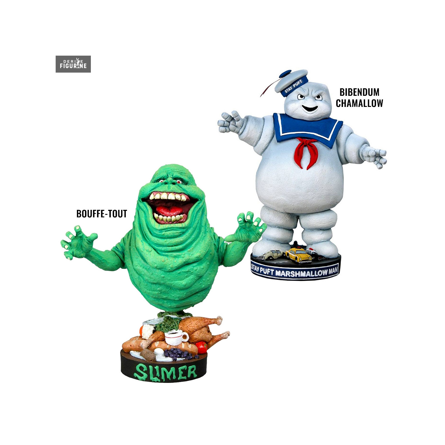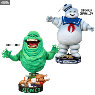 Les fans de S.O.S Fantômes (ou Ghostbusters) vont pouvoir se faire un petit plaisir en s'offrant une figurine de l'un de leurs fantômes préférés. Le premier est donc Bouffe-tout un revenant de couleur verte devenu l'ami des chasseurs de fantômes. Le second est donc le Bibendum Chamallow, mascotte de la marque de guimauves Stay Puft.