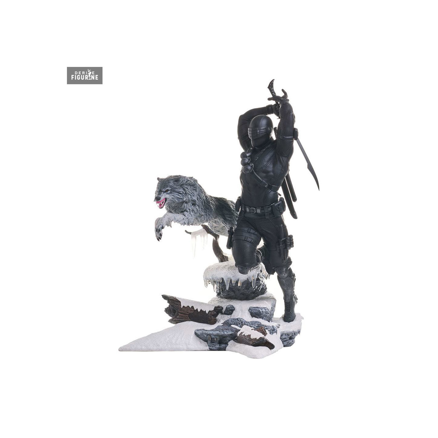 Snake Eyes est un personnage mystérieux de la licence G.I. Joe. On ne connaît pas sa vraie identité et sa tenue ne laisse pas apparaître de détails permettant de le reconnaître. Par contre, cette statuette de lui est vraiment chouette, car très dynamique et il y a même un loup blanc qui est souvent à ses côtés.