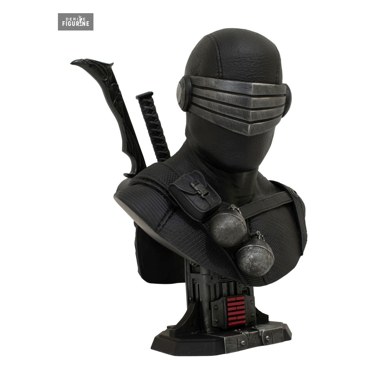 Buste officiel de Snake Eyes en résine mesurant environ 23 centimètres de haut, à l'échelle 1/2. Il est issu de la collection Legends in 3D. Le fabricant est Diamond Select Toys.