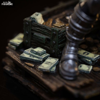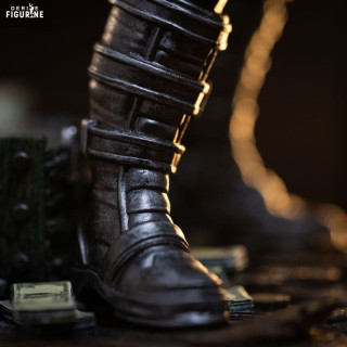 Cette statuette à l’échelle 1/10, haute d’environ 22 cm, présente Destro dans son costume noir renforcé, ceinturé de sangles rouges et agrémenté de son collier-diamant emblématique. Son pistolet doré, fumant encore, est appuyé sur son épaule, tandis que l’attaché-case Cobra, rempli de liasses de dollars et orné de l’emblème écarlate, est solidement tenu dans sa main gantée. La base reconstituant un sol de sous-sol industriel, semé de gravats et de billets, complète ce diorama nerveux.