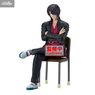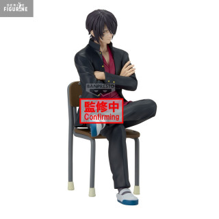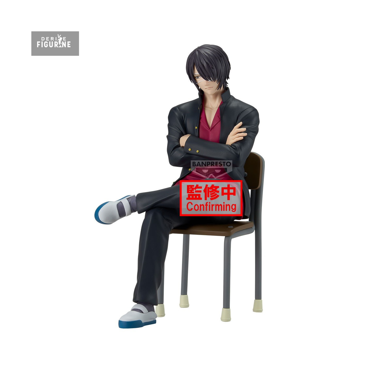 La figurine le montre assis nonchalamment sur une chaise d’école, bras croisés et regard perçant sous sa mèche sombre. Il porte un uniforme noir retroussé sur une chemise grenat décontractée, ses mocassins blancs à semelle turquoise complètent son allure désinvolte. L’expression impassible et les plis réalistes du tissu soulignent son attitude défiant l’autorité.