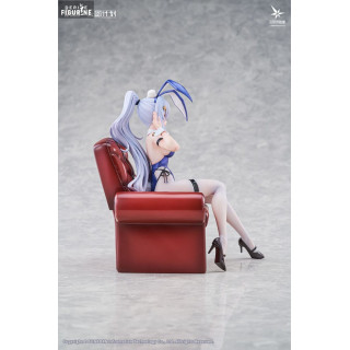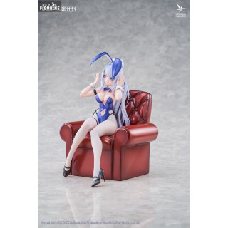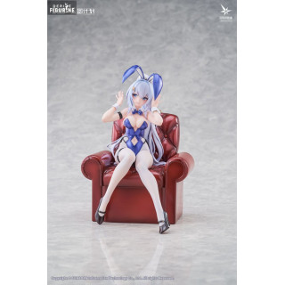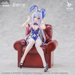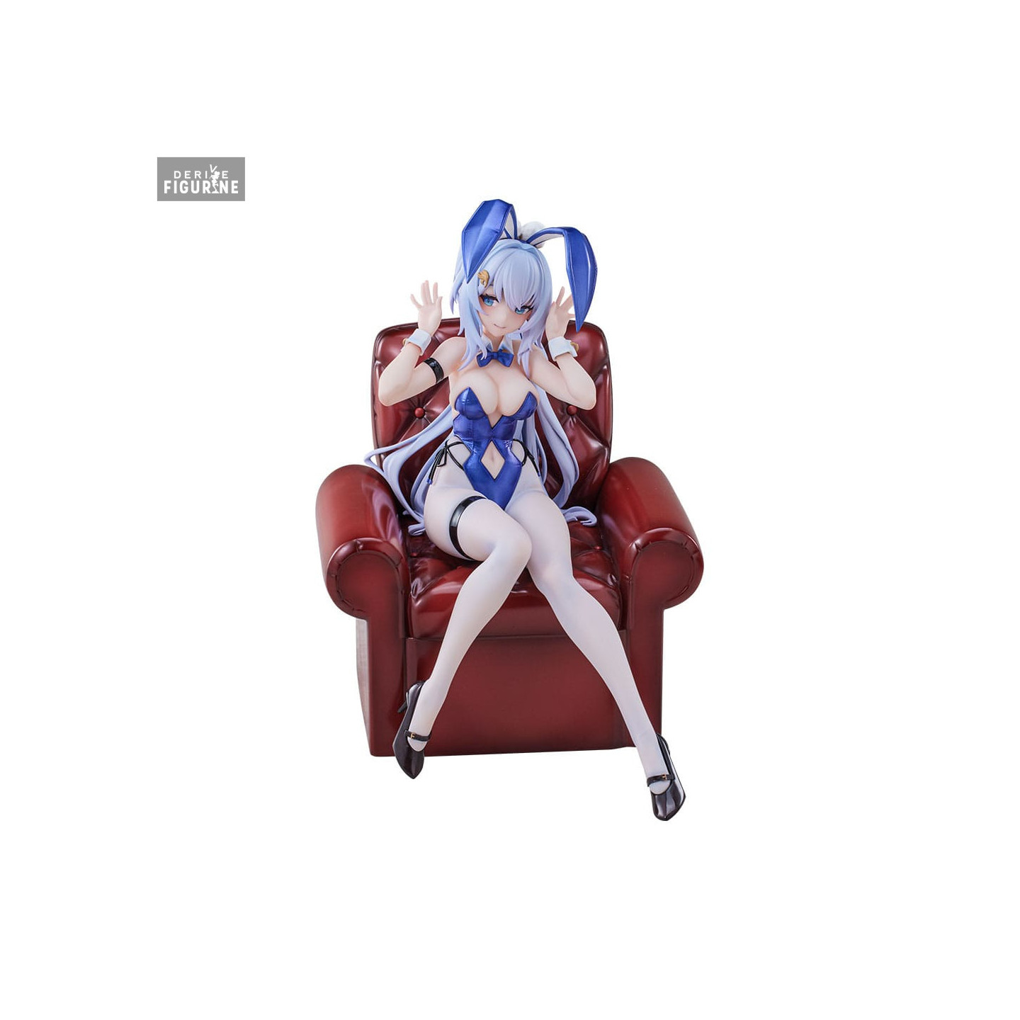 La figurine la montre assise dans un large fauteuil rouge aux textures détaillées, contrastant avec son costume bleu profond. Elle porte un body à oreilles de lapin assorti, orné de découpes géométriques, avec des bas blancs qui allongent ses jambes et des escarpins noirs brillants. Ses longs cheveux bleus tombent en cascade de chaque côté, et son sourire malicieux accompagné d’une posture dynamique lui donnent une aura à la fois séduisante et joueuse.