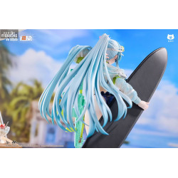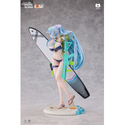 Son look repose sur des éléments très marqués : longs cheveux bleus coiffés en mèches fluides, masque de plongée orné d’un coquillage sur la tête, et multiples fleurs tropicales décorant sa cheville, sa cuisse et sa taille. Elle tient une grande planche de surf noire contre elle, et son socle en forme de sable, orné d’étoiles de mer, accentue l’atmosphère estivale. Ses yeux sont dissimulés par sa frange, renforçant son mystère.
