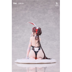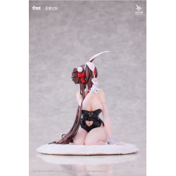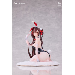 La figurine repose uniquement sur ce qui est visible : Jiangyu est agenouillée sur un tapis blanc moelleux, vêtue d’un costume noir de style bunny. Les détails ressortent nettement, comme les oreilles rouges, les rubans assortis, les pompons blancs sur les poignets et le bas du dos, ainsi que ses longs cheveux bruns noués en mèches ornées de petits accessoires. Sa posture est courbée vers l’avant, une main levée dans un geste léger, avec une expression douce et un regard légèrement détourné.
