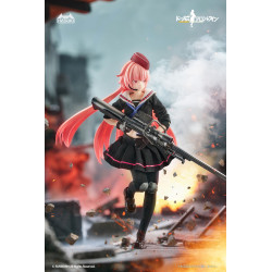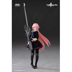 Visuellement, la figurine reprend sa longue chevelure rose attachée en queue de cheval basse, avec une frange qui encadre son visage et un petit béret rose posé sur le dessus de la tête. Elle porte une tenue sombre qui rappelle un uniforme scolaire revisité : veste noire à col marin, liserés roses, ruban bleu à la poitrine et jupe courte assortie. Ses jambes sont couvertes de collants noirs, complétés par des protections aux genoux et des chaussures brunes détaillées. Elle tient son imposant fusil de précision noir et gris, équipé d’un long canon, d’une crosse massive, d’un bipied et d’un viseur, dont la longueur contraste avec sa silhouette fine. Les articulations visibles aux bras, aux jambes et au buste permettent de varier les poses autour de son arme une fois exposée.