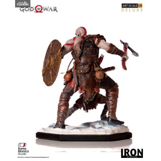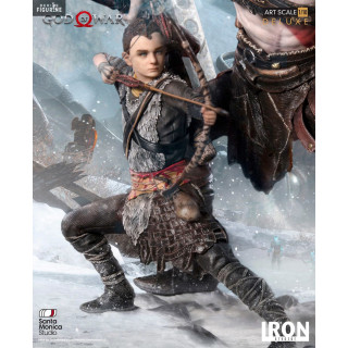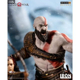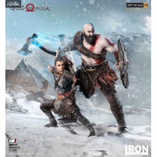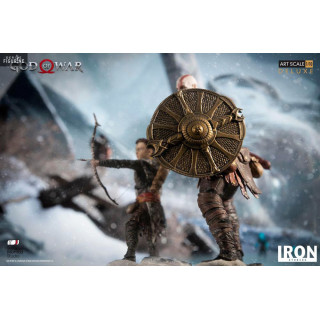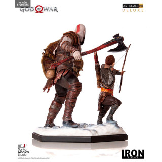 Figurine officielle de Kratos & Atreus en résine mesurant environ 20 centimètres de haut, à l'échelle 1/10. Elle est issue de la collection Deluxe Art Scale. Le fabricant est Iron Studios.