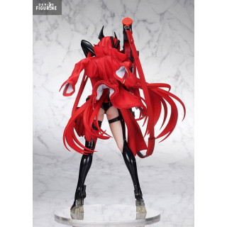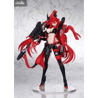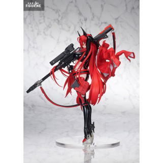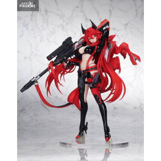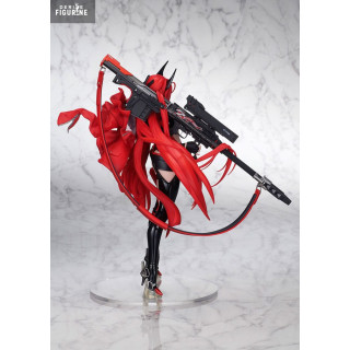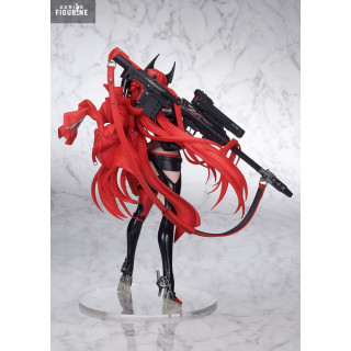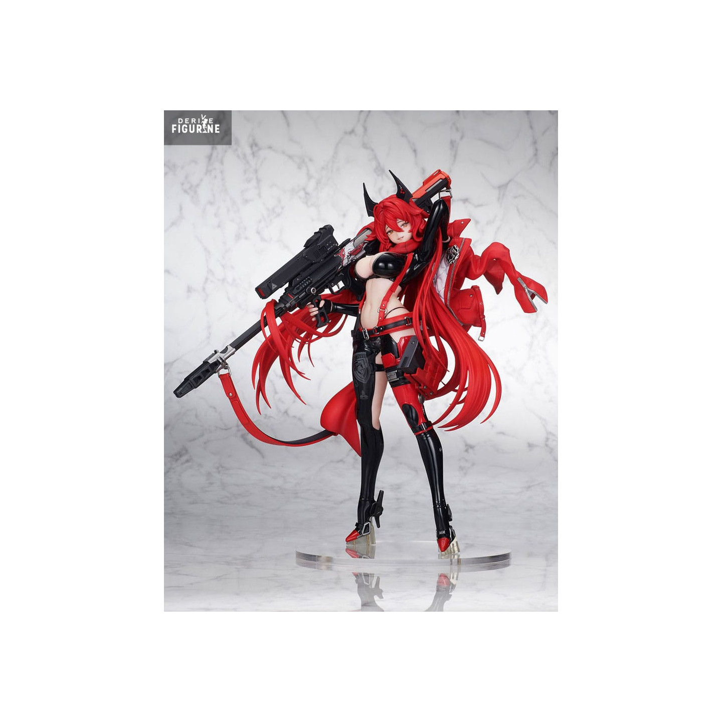 La figurine présente un design ultra-détaillé : longue chevelure rouge ondulante, cornes saillantes, manteau rouge sculpté en mouvement, et tenue noire brillante à l’allure tactique. Chaque élément de son équipement, jusqu’au fusil de sniper surdimensionné qu’elle porte nonchalamment sur l’épaule, participe à son esthétique unique et futuriste. Le contraste entre les textures mates et brillantes renforce la richesse visuelle de l’ensemble.