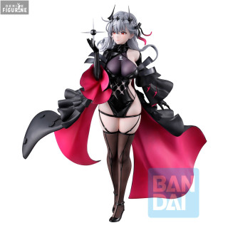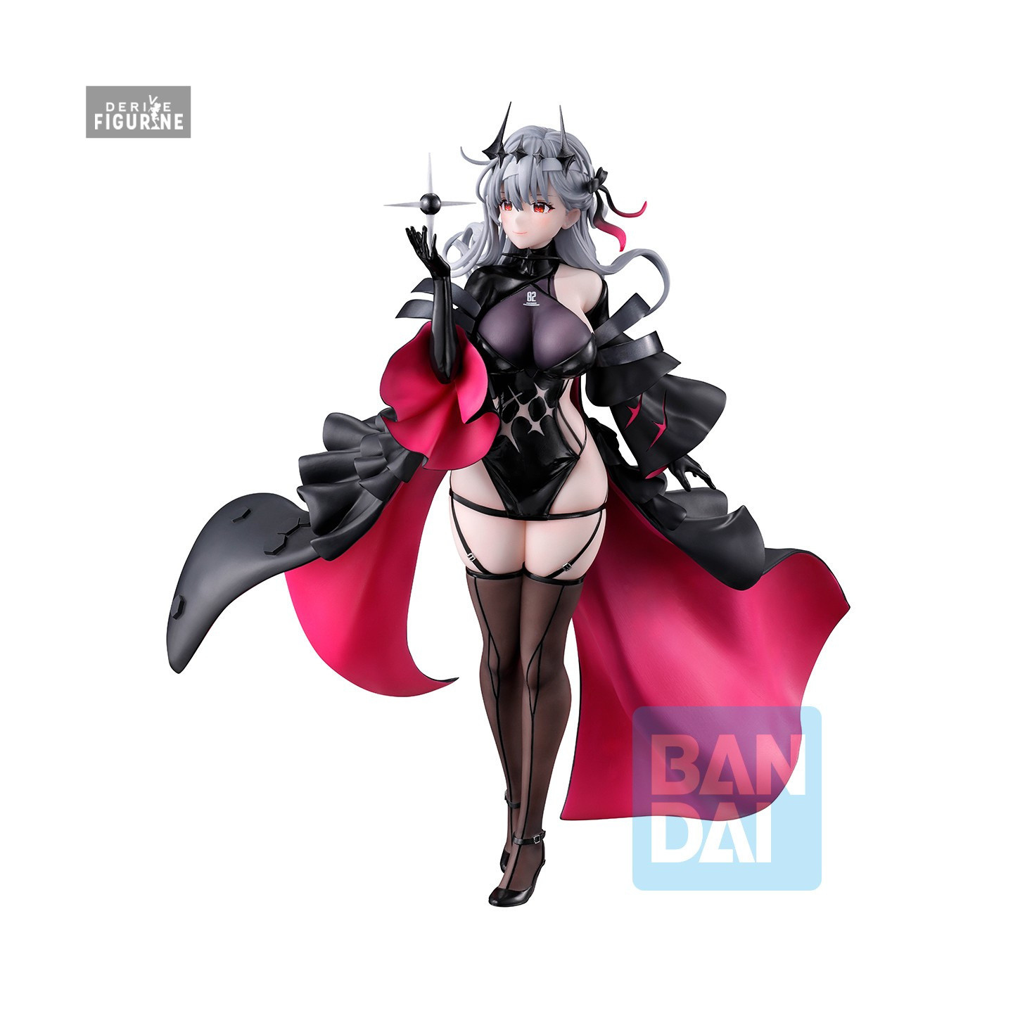 Dans cette version issue de la collection Ichibansho, Modernia se tient debout, affichant une posture assurée et captivante. Elle porte une tenue noire moulante au design travaillé, relevée par des touches de rouge vif à l’intérieur de sa cape, et un corset laissant transparaître un motif sophistiqué sur la poitrine. Ses longs cheveux argentés sont ornés d’accessoires noirs, et elle tient dans sa main gauche un objet évoquant une arme ou un artefact, renforçant son aura de puissance.
