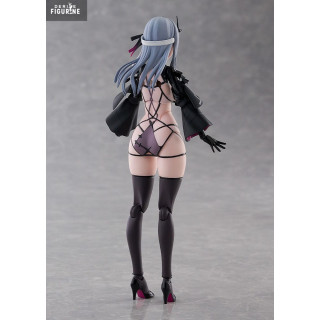 La figurine, issue de la gamme Figma, respecte avec minutie son apparence : combinaison noire ultra détaillée, collants transparents, gants renforcés et armement mécanique imposant fixé dans son dos. Les cornes sur sa tête et ses cheveux argentés légèrement ondulés accentuent son allure à la fois élégante et intimidante. L’intérieur de sa cape révèle un contraste de violet intense.