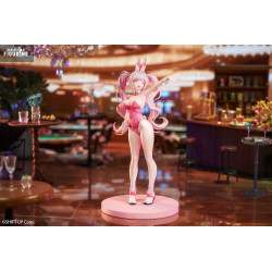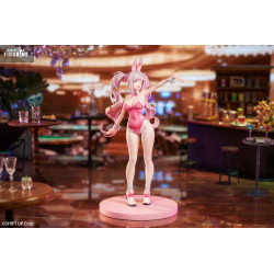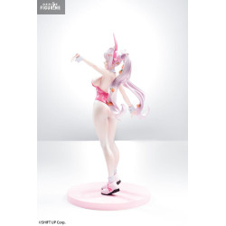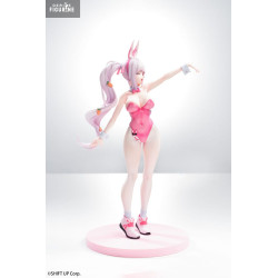 La figurine affiche de nombreux détails : oreilles de lapin assorties, collerette à nœud papillon, manches ballons, bottines hautes avec semelles épaisses, et des rubans dans ses longues couettes rose pâle. Le tout repose sur un socle rond rose uni, simple mais cohérent avec l’esthétique générale.