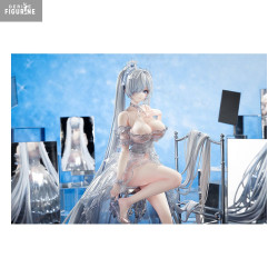 Éléments spéciaux : socle décoratif circulaire, chaise effet chrome, soulier détachable, robe semi-transparente