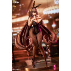 La figurine la présente debout, en pleine confiance, les mains délicatement posées sur son corset noir brillant. Sa silhouette généreuse, ses collants en résille réalistes et ses longues mèches brunes parfaitement sculptées lui donnent une présence immédiate, renforcée par ses talons noirs et ses oreilles de lapin dorées.