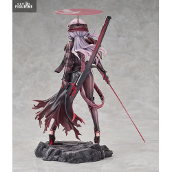 La figurine restitue parfaitement cette identité visuelle : longue chevelure violette légèrement ondulée, regard déterminé, combinaison noire brillante soulignant sa silhouette et cape rouge déchirée flottant derrière elle. L’arme qu’elle tient, fine et rouge, ainsi que la large lame fixée dans son dos renforcent l’intensité de sa posture. Le socle rocheux, texturé, complète la mise en scène.