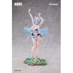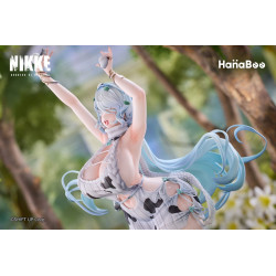 La figurine la montre portant une tenue blanche décorée de motifs noirs façon vache, structurée par des ouvertures et des rubans flottants. Sa longue chevelure bleu pastel, sculptée en mèches légères, accompagne le mouvement. Des accessoires discrets comme un collier, des bracelets, des ornements de cheveux et des bijoux de cheville ajoutent de petits points d’éclat. Le socle représente un morceau de terrain verdoyant, renforçant l'ambiance champêtre.