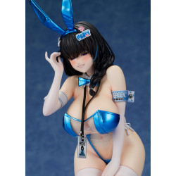 La figurine la montre vêtue d’un costume bunny métallisé bleu vif : oreilles dressées, nœud papillon assorti et top brillant maintenu par un zip décoratif. Des bandeaux translucides aux bras portent des inscriptions évoquant son thème médical, tandis qu’un bracelet rouge à la cheville ajoute un contraste marqué. Ses bas blancs semi-transparents et ses chaussures à talons complètent la tenue. Sa longue chevelure noire tombe en mèches épaisses, encadrant son visage partiellement caché, ce qui renforce son air réservé.