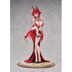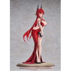 Visuellement, la figurine met en avant sa longue chevelure rouge qui cascade dans son dos et autour de ses épaules, accompagnée de deux grandes cornes sombres qui renforcent son allure démoniaque. Elle porte une robe de soirée rouge très ajustée, fendue jusqu’à la cuisse, qui laisse apparaître une partie de ses jambes, ainsi qu’un haut de type bikini assorti relié par des sangles sombres qui croisent son buste. Une veste noire glissée sur ses épaules, sans être complètement enfilée, ajoute une touche de nonchalance à l’ensemble. Des éléments de lanières autour de la cuisse, des talons sombres et un socle ovale décoré complètent la mise en scène, offrant une pièce qui attire immédiatement l’œil une fois exposée.