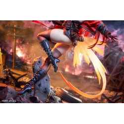 Visuellement, la figurine montre Rapi avec de très longs cheveux rouges qui s’envolent derrière elle, coiffés d’un béret sombre qui renforce son allure militaire. Elle porte un haut gris ajusté et une veste rouge courte, ouverte, dont la capuche et les manches rappellent le thème « Red Hood », combinés à un short noir et à des sangles tactiques autour de la taille et de la cuisse. Sa jambe levée révèle des bottes montantes noires à lacets et des protections, tandis que des rubans ou effets d’énergie jaune-orangé jaillissent de son dos pour accentuer la sensation de mouvement. Elle tient un fusil d’assaut massif rouge et noir, riche en détails mécaniques, et repose sur un large socle rocailleux jonché de débris et de douilles, qui apporte stabilité et présence une fois la figurine exposée.