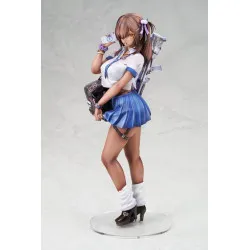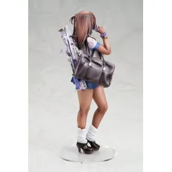 Visuellement, elle porte une tenue d’écolière : chemisier blanc à manches courtes avec détails bleus, cravate bleue, et jupe plissée bleue. Ses cheveux châtain sont attachés en queue de cheval sur le côté, avec un accessoire blanc et un ruban violet, et son expression est calme, légèrement assurée. Elle tient un petit objet près de l’oreille, et porte un gros sac/boîtier noir contre la hanche, tandis qu’un grand module mécanique gris clair et bleu est fixé dans son dos, comme un équipement de combat. Elle est pieds nus dans des chaussettes hautes blanches façon guêtres et des chaussures marron à talons ; la pose en appui lui donne une silhouette naturelle à exposer.