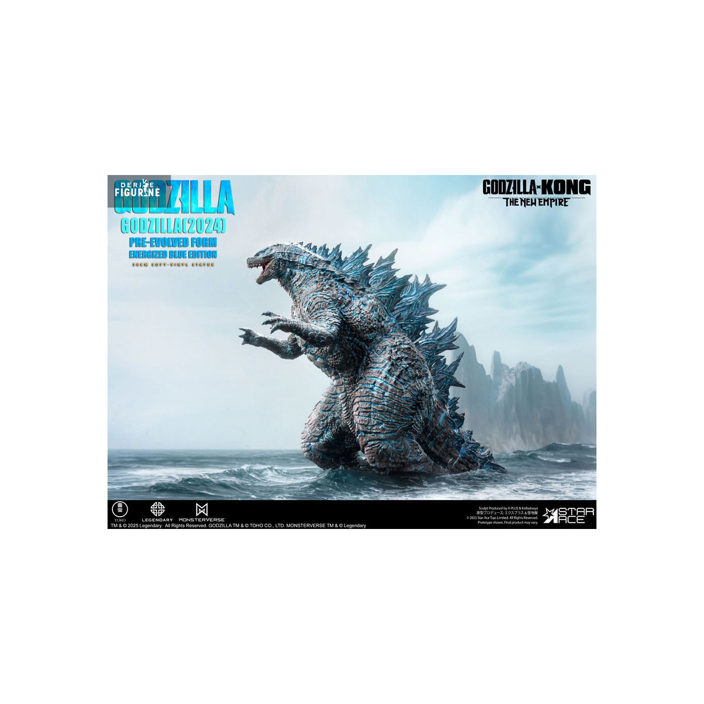 Figurine officielle de Godzilla (2024) Pre-Evolved Form Energized Blue Edition en vinyle mesurant environ 28 centimètres de haut. Elle est issue de la collection Soft Vinyl. Le fabricant est Star Ace.