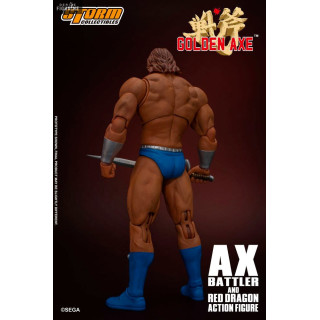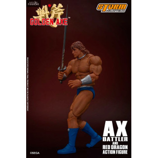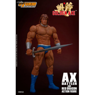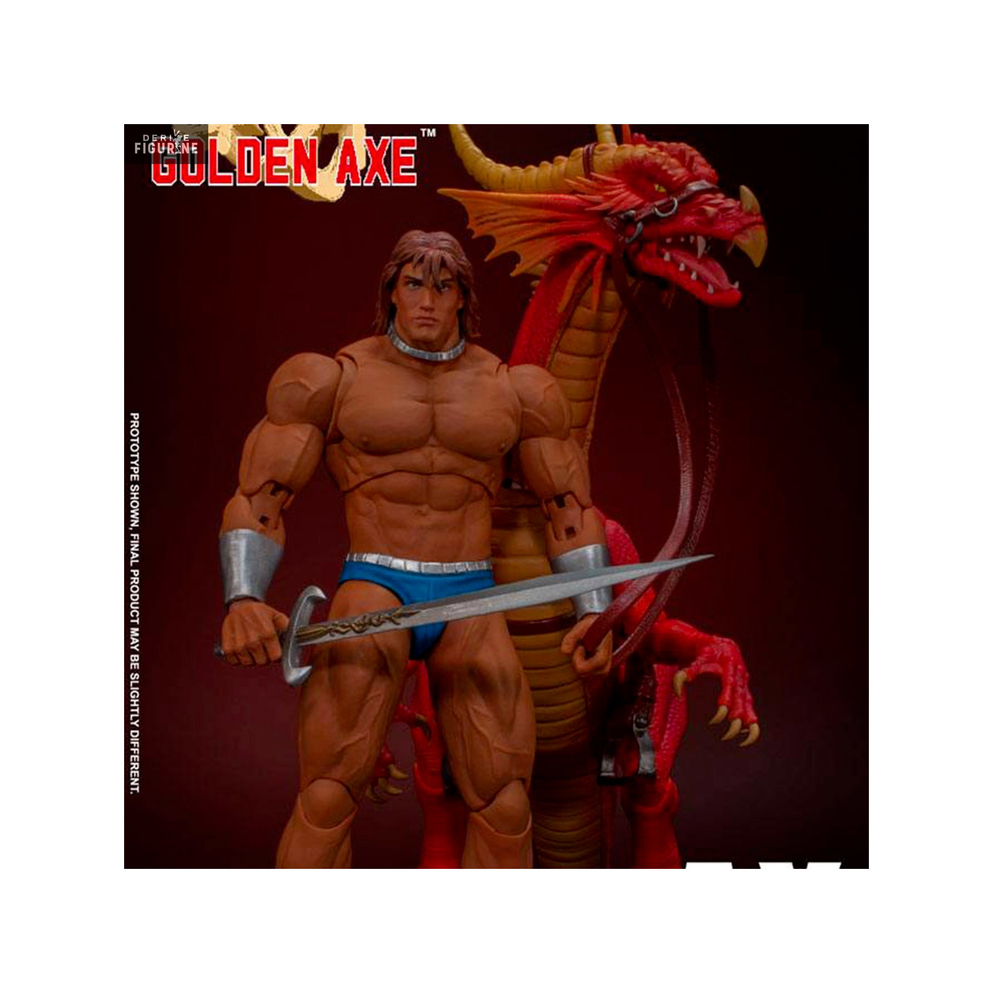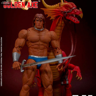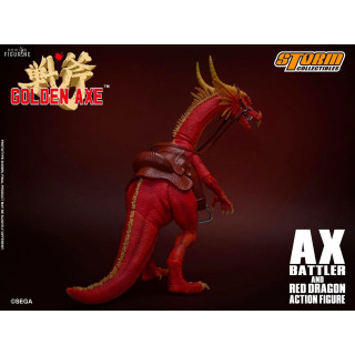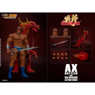 Golden Axe est un jeu vidéo de type hack dans slash et voici une figurine de l'un des personnages jouables à savoir le Ax Battler. Spécialisé dans la force, il combat avec une épée à deux mains mais il est aussi capable de faire usage de la magie de la Terre. Le héros est accompagné d'une figurine de sa monture qui est un dragon rouge. Il est possible de prendre le contrôle d'un dragon en monture en dépossédant les ennemis de ce dernier.