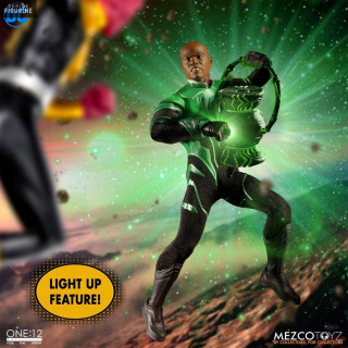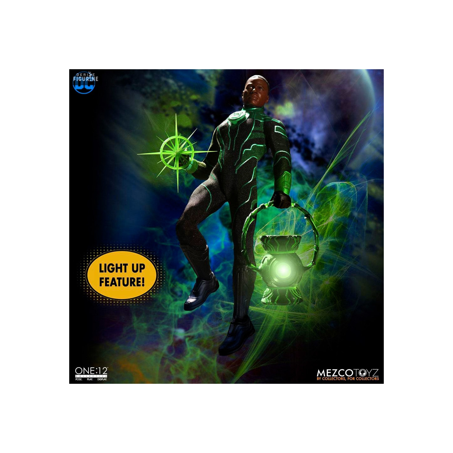 Figurine officielle de John Stewart mesurant environ 17 centimètres de haut, à l'échelle 1/12. Le fabricant est Mezco Toys.