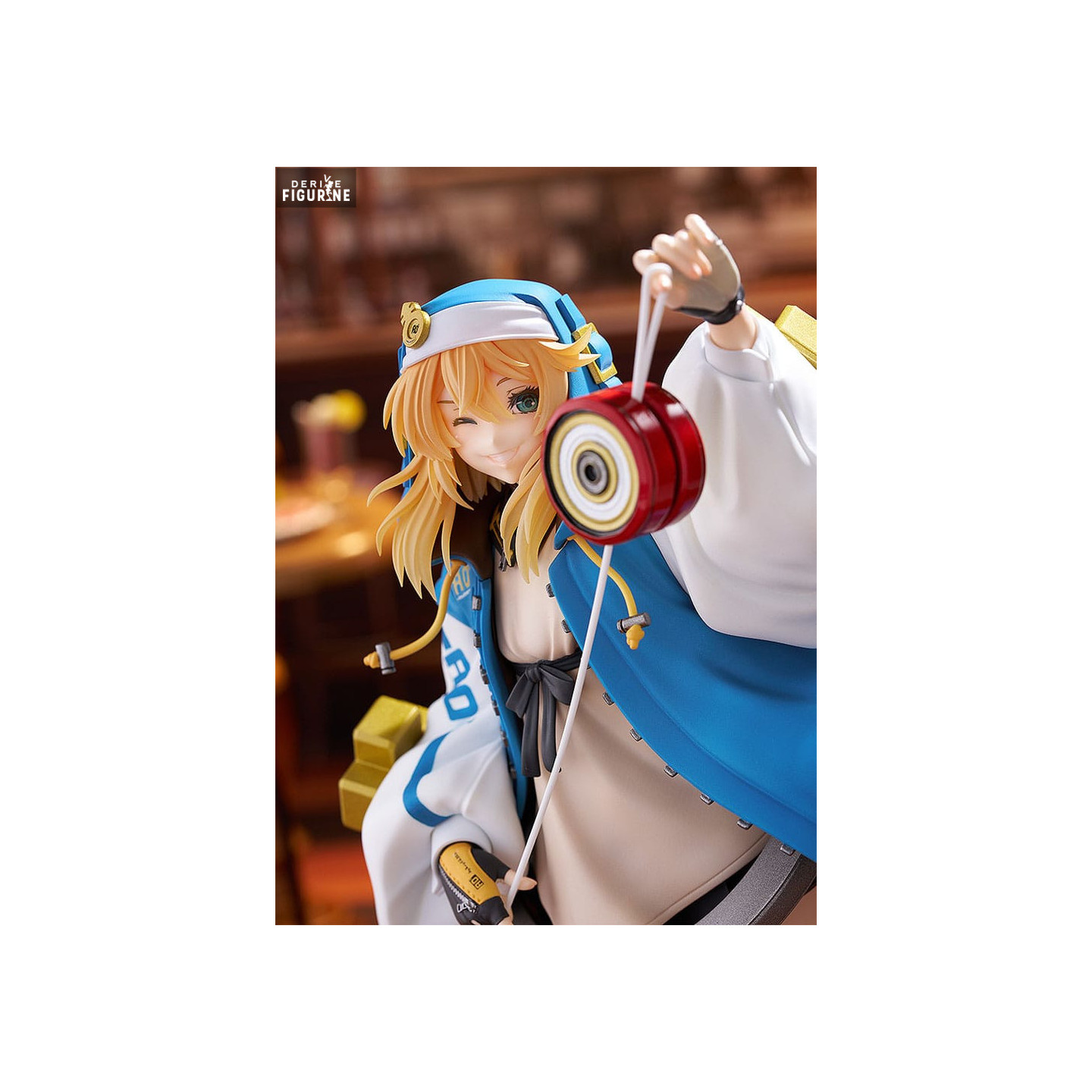 Bridget est représentée dans une posture dynamique et confiante, avec son yo-yo emblématique prêt à être lancé, mettant en valeur son rôle de combattant agile et ingénieux. Sa tenue, composée d'une robe blanche rehaussée par un manteau bleu vif orné de détails dorés, est minutieusement sculptée pour refléter son esthétique vibrante et colorée. Les détails, tels que ses bottes modernes, son couvre-chef distinctif et l'énorme chaîne qu’elle porte, ajoutent une touche supplémentaire de réalisme et de personnalité à la figurine.