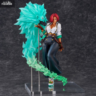 Le travail de sculpture impressionne par sa précision : chaque pli de ses vêtements, la finesse de ses accessoires et l’attitude féline de sa posture traduisent parfaitement son caractère. Sa chemise légèrement entrouverte et son pantalon large flottent subtilement, comme figés dans un instant d’action, donnant l’impression que Giovanna s’apprête à bondir. Rei, sculpté dans un matériau translucide, se déploie derrière elle avec une chevelure d’énergie fluide aux nuances de vert éclatant.