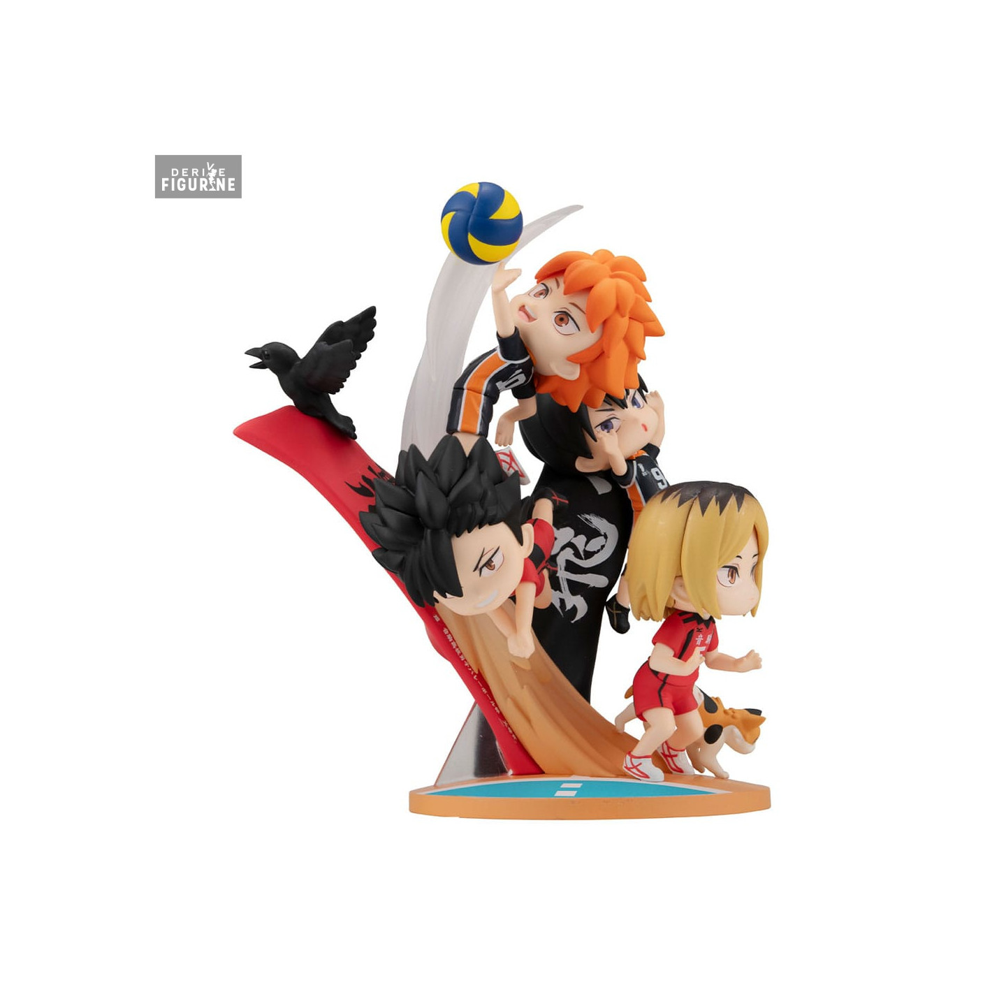 Visuellement, la figurine est un condensé d’émotions et de mouvements. Chaque personnage est représenté en chibi, avec une grande expressivité dans les visages et des postures dynamiques. Les uniformes, les coiffures, la balle de volley en suspension, les accessoires comme le corbeau ou les effets d’impact soulignent l’instant figé d’un échange crucial. Les couleurs sont vives, et les détails minutieux renforcent l’impact visuel de la scène.