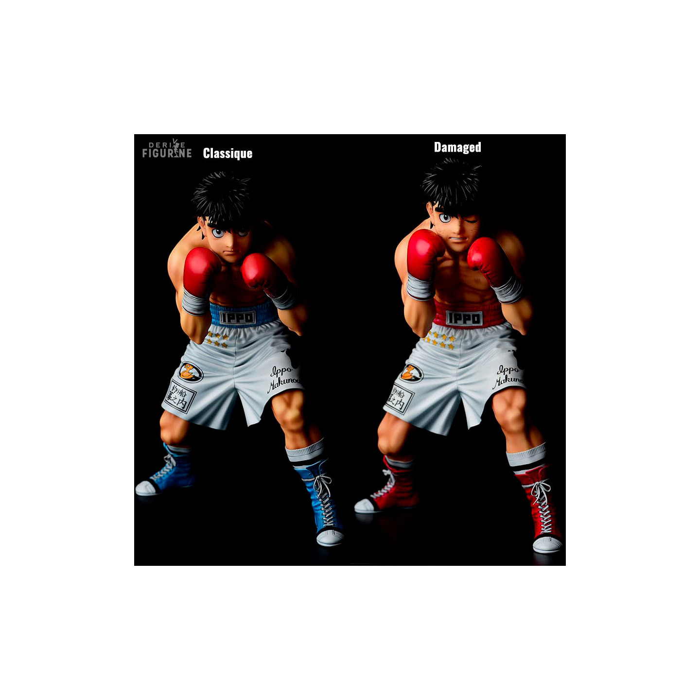 Ippo Makunouchi est un jeune boxeur au cœur vaillant et à la détermination inébranlable. Issu d'un milieu modeste, il découvre sa passion pour la boxe après avoir été sauvé d'une agression par le légendaire boxeur Mamoru Takamura. Ippo est un combattant humble et réservé, mais derrière son apparence timide se cache une force insoupçonnée. Son travail acharné, sa discipline et son dévouement l'ont propulsé vers les sommets du monde de la boxe, où il cherche à devenir le champion ultime. Avec son courage infatigable et sa capacité à surmonter les obstacles, Ippo est une véritable inspiration pour ceux qui l'entourent et un adversaire redoutable sur le ring. Vous pouvez ici choisir entre deux figurines d'Ippo, soit classique où il n'est pas encore touché, soit la version damaged où l'on remarque trace et coups sur son corps ainsi que l'oeil fermé.