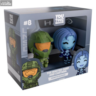 Figurines officielles de The Master Chief & Cortana Monitor, Buddiez en vinyle mesurant environ 5-6 centimètres de haut. Le fabricant est Youtooz.