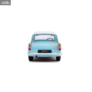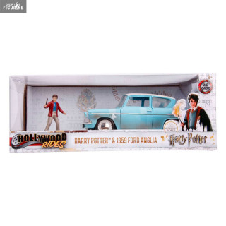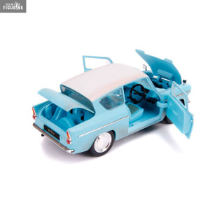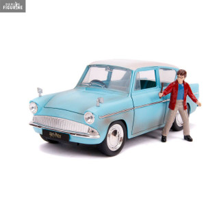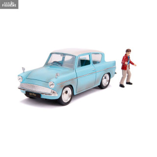 Réplique officielle du 1959 Ford Anglia avec figurine Harry Potter en die cast et plastique injecté avec figurines de Scooby et Sammy, à l'échelle 1/24. Le fabricant est Jada Toys.