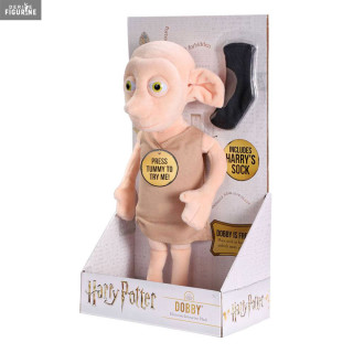 Dobby est un elfe de maison et doit donc être au service de ses maîtres. Malheureusement pour lui, c'est auprès de la famille Malefoy qu'il est tombé. Par contre, grâce à Harry Potter et la chaussette qu'il lui a offert, il a pu retrouver sa liberté. Vous avez donc une peluche de Dobby qui possède des fonctions sonores (parle en anglais) et la fameuse chaussette de Harry.