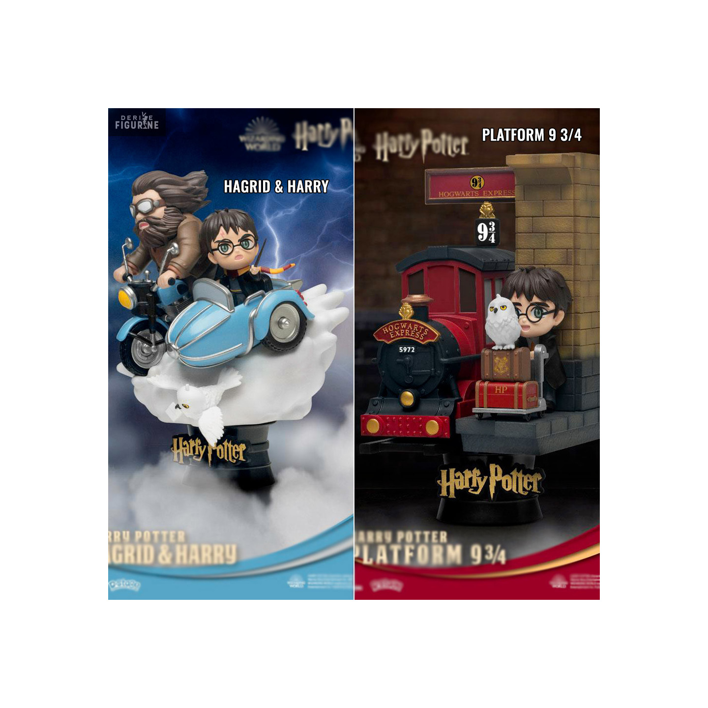 Harry Potter s'offre deux figurines D-Stage et vous avez le choix entre deux modèles : Soit Hagrid & Harry montrant les deux personnages fonçant à toute allure à bord de la moto d'Hagrid ou bien alors la figurine Platform 9 3/4 montrant Harry avec Hedwige à la célèbre gare des sorciers ! Une fois le choix fait, vous pouvez soit opter pour la version New Version où un assemblage facile est nécessaire et où vous avez une boîte carton ou bien alors la version Standard avec une boîte vitrine et la figurine déjà montée.