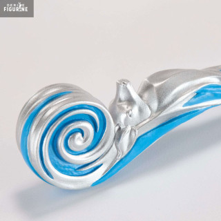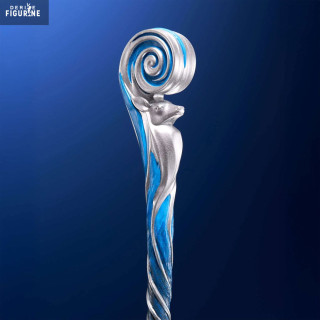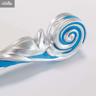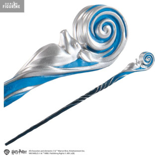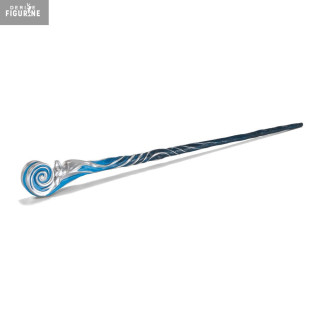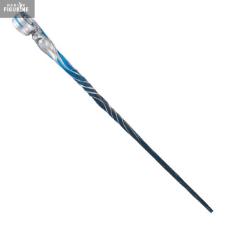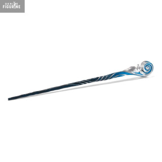 Le design met en avant un manche délicatement torsadé, partant d’une base argentée ornée d’arabesques en spirale pour s’épanouir en une baguette bleu nuit striée d’argent. La finition polyrésine rend hommage aux ondulations lumineuses du Patronus, avec un dégradé subtil du bleu clair au bleu profond. Le tout repose sur un socle transparent, accompagné d’une médaille commémorative “2025” reprenant le motif spiralé.