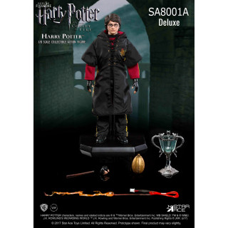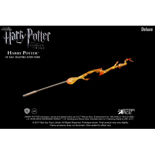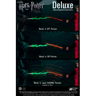 Ce Harry Potter est une version provenant du film Harry Potter et la Coupe de feu. Harry est donc paré à participer au tournoi des trois sorciers. En plus des accessoires principaux disponibles dans la version classique, si vous optez pour la version Deluxe un peu plus cher, vous allez obtenir le bâton d'Harry qui peut s'illuminer et donner un effet électrique grâce à deux piles AA qui ne sont, on le rappelle, pas fournies.