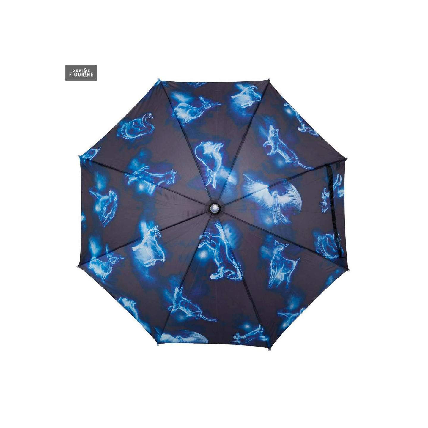 Parapluie lumineux officiel Harry Potter Patronus avec éclairage par LED. Diamètre ouvert : 100 centimètres. Le fabricant est Bioworld. Nécessite trois piles AAA non fournies.