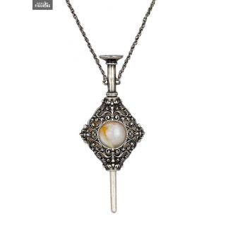 Collier représentant le pendentif de Gellert Grindelwald en métal plaqué argent patiné, mesurant environ 8 centimètres avec une chaîne de 66 centimèters. Le fabricant est Noble Collection.