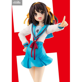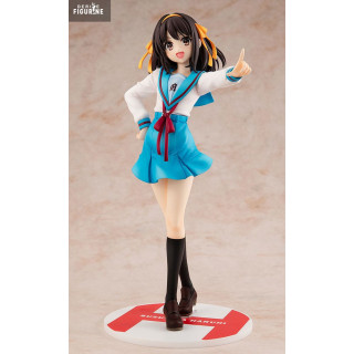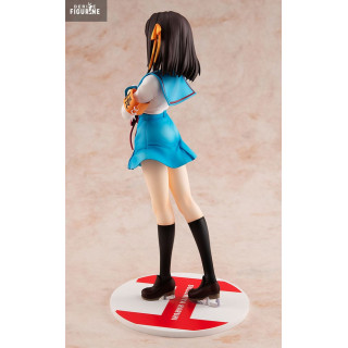 Figurine officielle de Haruhi Suzumiya en PVC mesurant environ 23 centimètres de haut, à l'échelle 1/7. Le fabricant est Kadokawa.