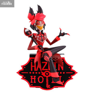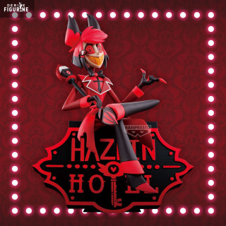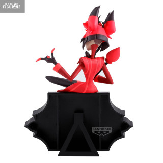 Sculpté en PVC d’environ 17 cm de haut, ce modèle le présente assis les jambes croisées sur le panneau “Hazbin Hotel”, micro-trotteur à la main. Son costume rayé, ses ongles acérés et ses longues oreilles pointues forment un contraste saisissant avec le fond noir et rouge du socle. Les finitions nettes et les aplats de couleur vifs soulignent son aura maléfique et son élégance sinistre.