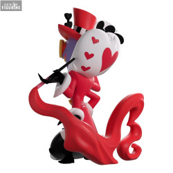 Fidèle au style visuel unique de la série, cette figurine en vinyle de 13 cm capture parfaitement l’esthétique théâtrale du personnage. On y retrouve son chapeau haut-de-forme rouge décoré de cœurs noirs et blancs, ses lunettes en forme de cœurs, son large sourire carnassier et sa tenue assortie aux motifs exagérés. Sa posture penchée, une main griffue sur la hanche et l’autre tenant une cigarette, le rend instantanément reconnaissable.