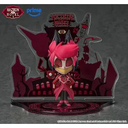 Visuellement, on le voit en version chibi, avec une chevelure rose vif en mèches pointues et un visage stylisé aux grands yeux, avec un large sourire. Il porte une tenue rouge avec des pans de manteau, et tient un bâton terminé par un élément rond, façon micro/canne. L’ensemble est présenté devant un décor en silhouette noir et rouge, avec une grande façade et une enseigne “Hazbin Hotel” en haut, le tout posé sur une base circulaire translucide rouge sombre avec un motif imprimé.
