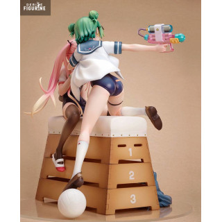 Midori, explosive, saute presque hors de la scène, armée de son pistolet à eau multicolore, lunettes sur le front et blouse de labo au vent. Pink, plus posée, arbore un air mi-blasé, mi-amusé, jambes croisées avec nonchalance. Elle contrebalance à merveille le dynamisme de sa camarade. L’ensemble repose sur un grand caisson de gym typique des écoles japonaises, avec un ballon, un sac de sport et quelques accessoires éparpillés au sol, pour une mise en scène ultra vivante.